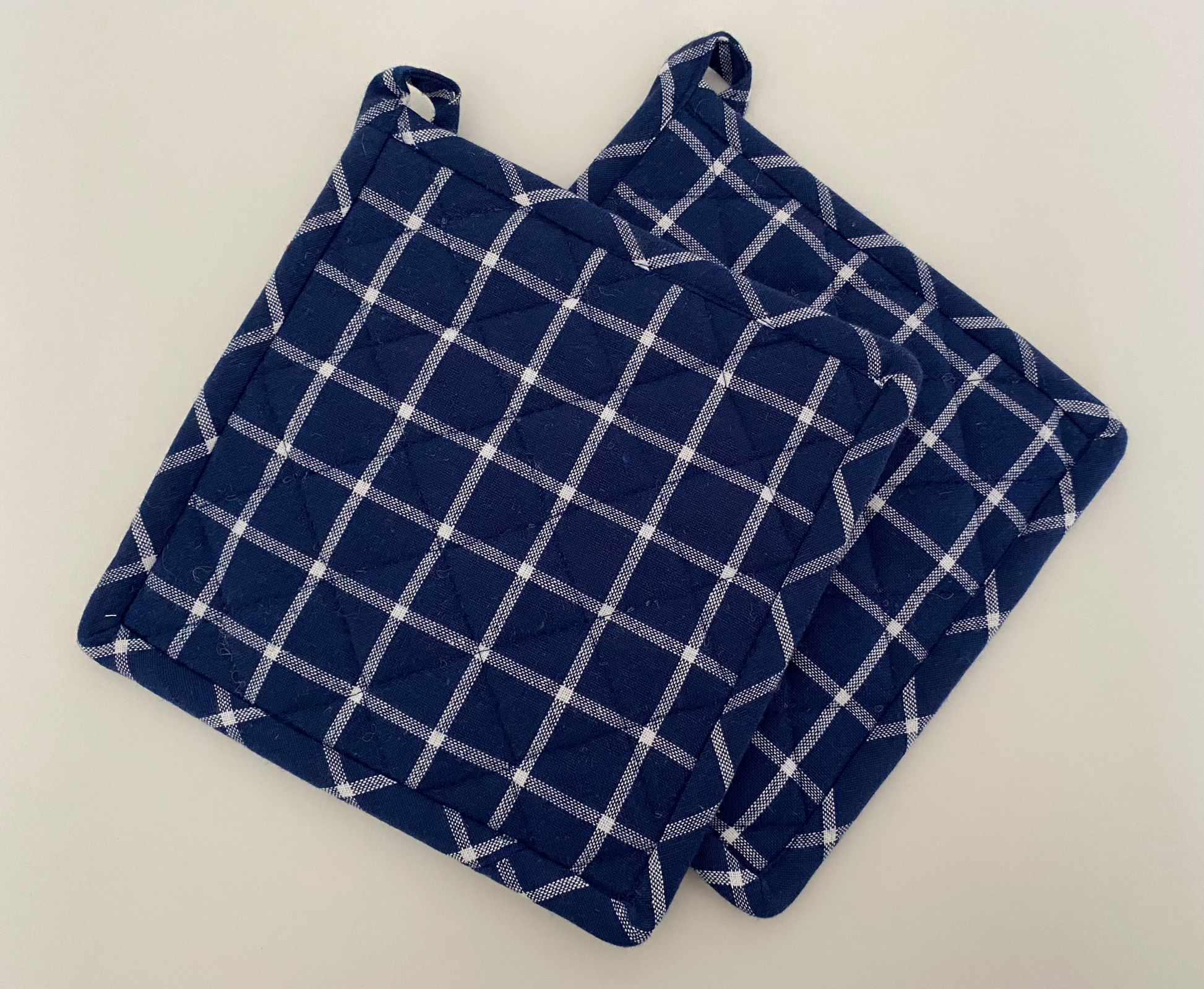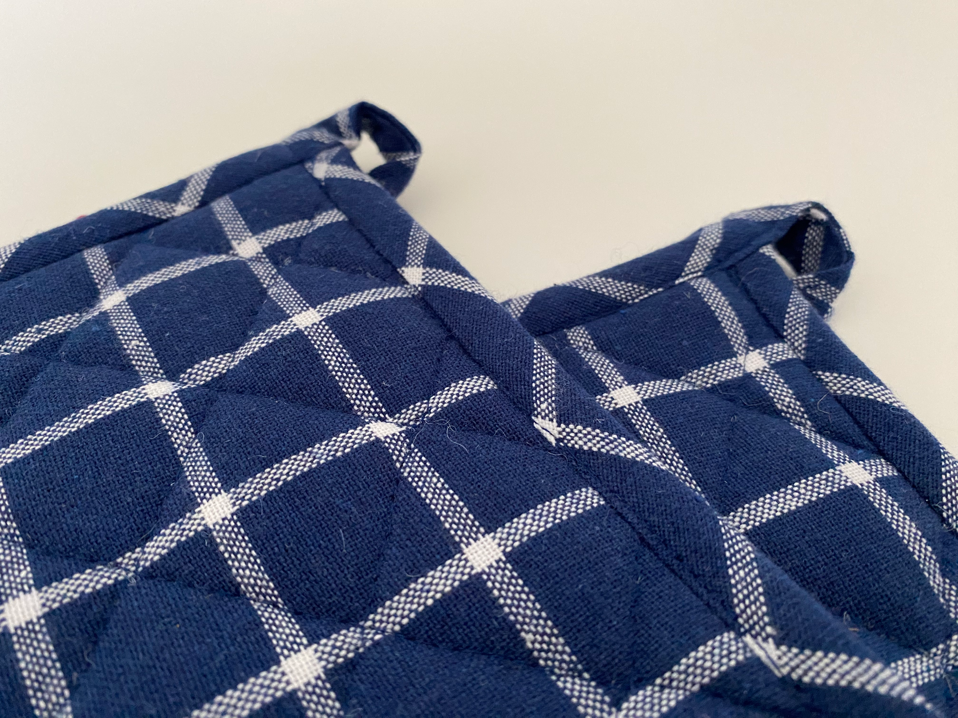 Blå- og hvidternede genbrugs grydelapper i genbrugte materialer.