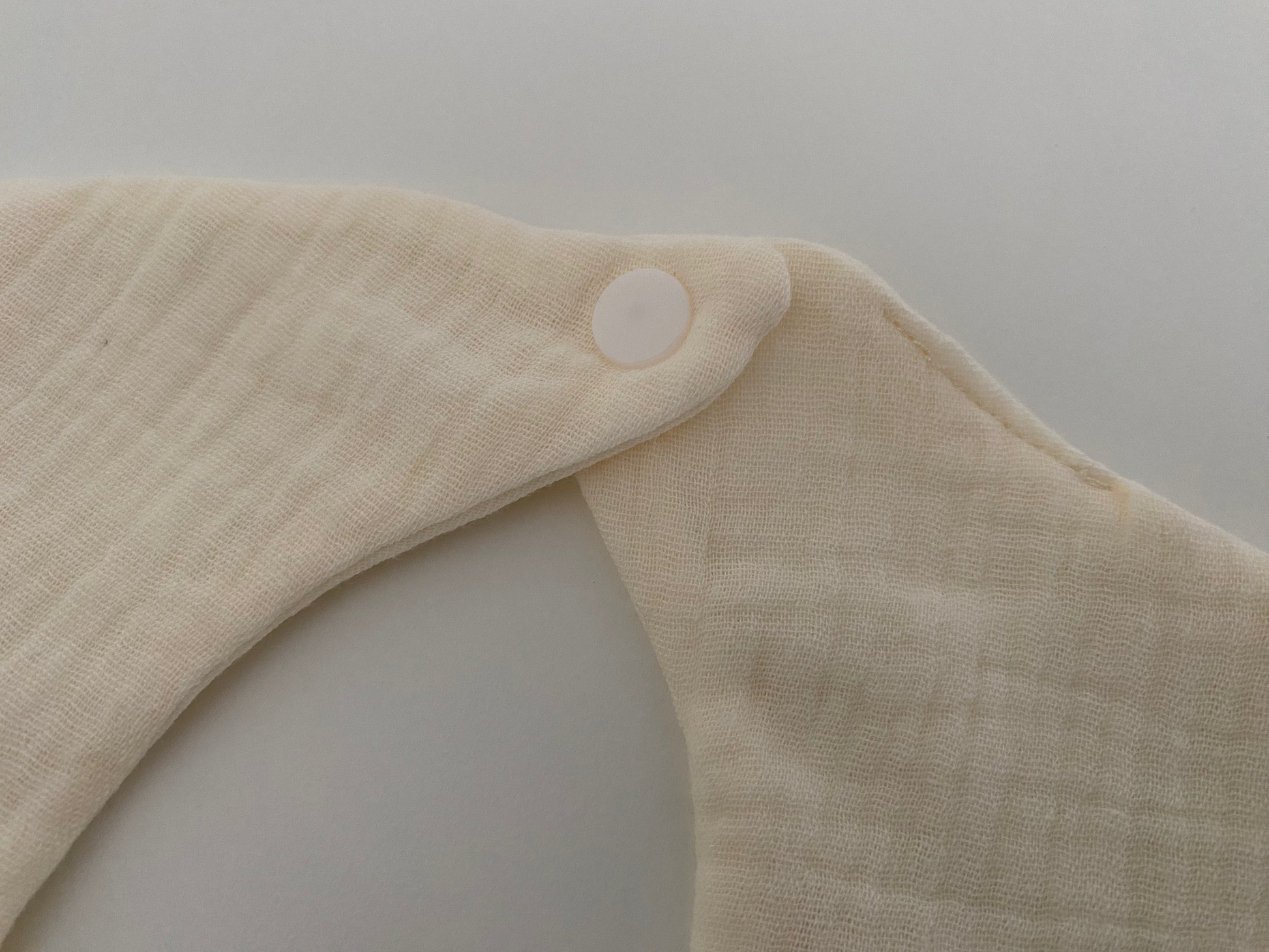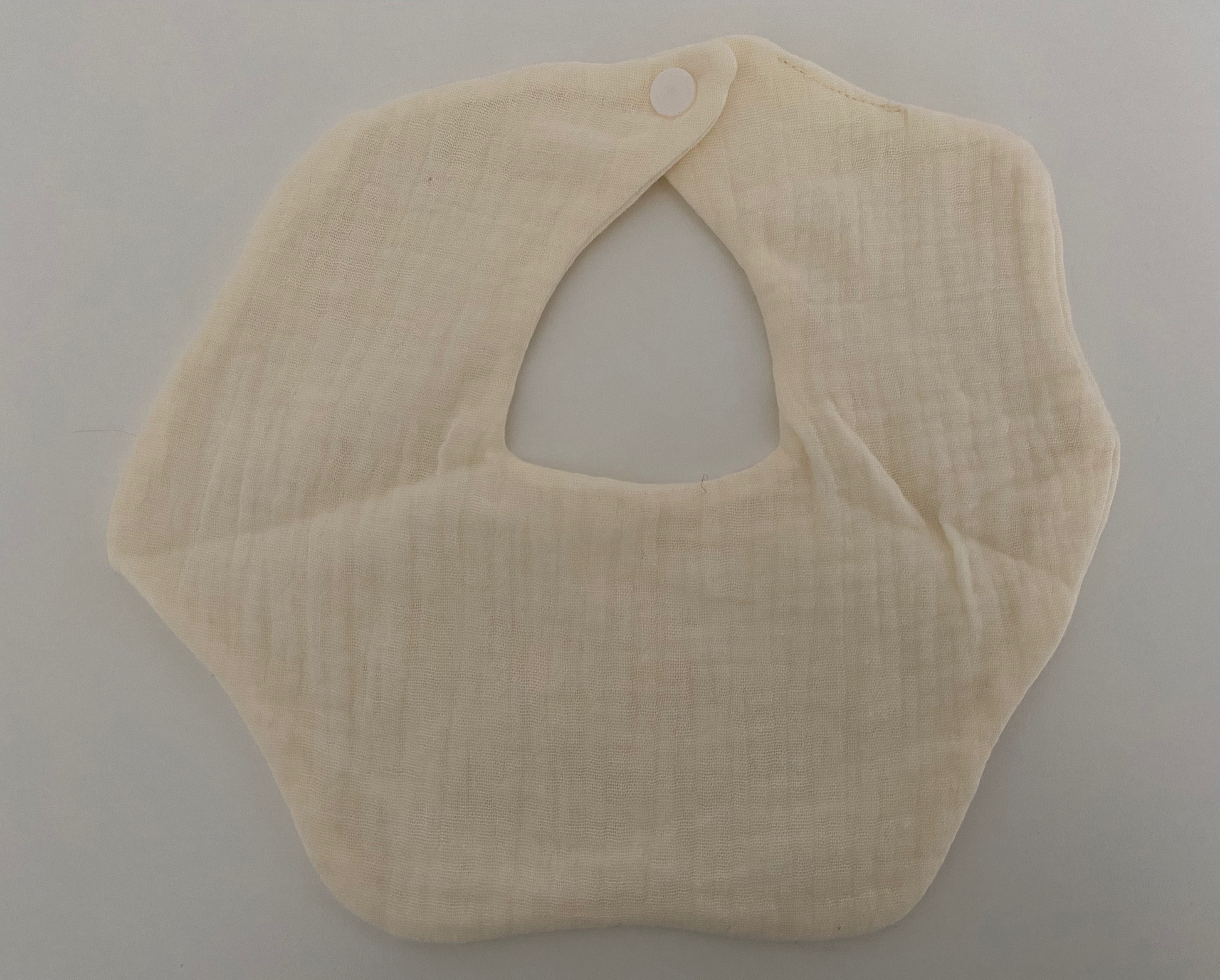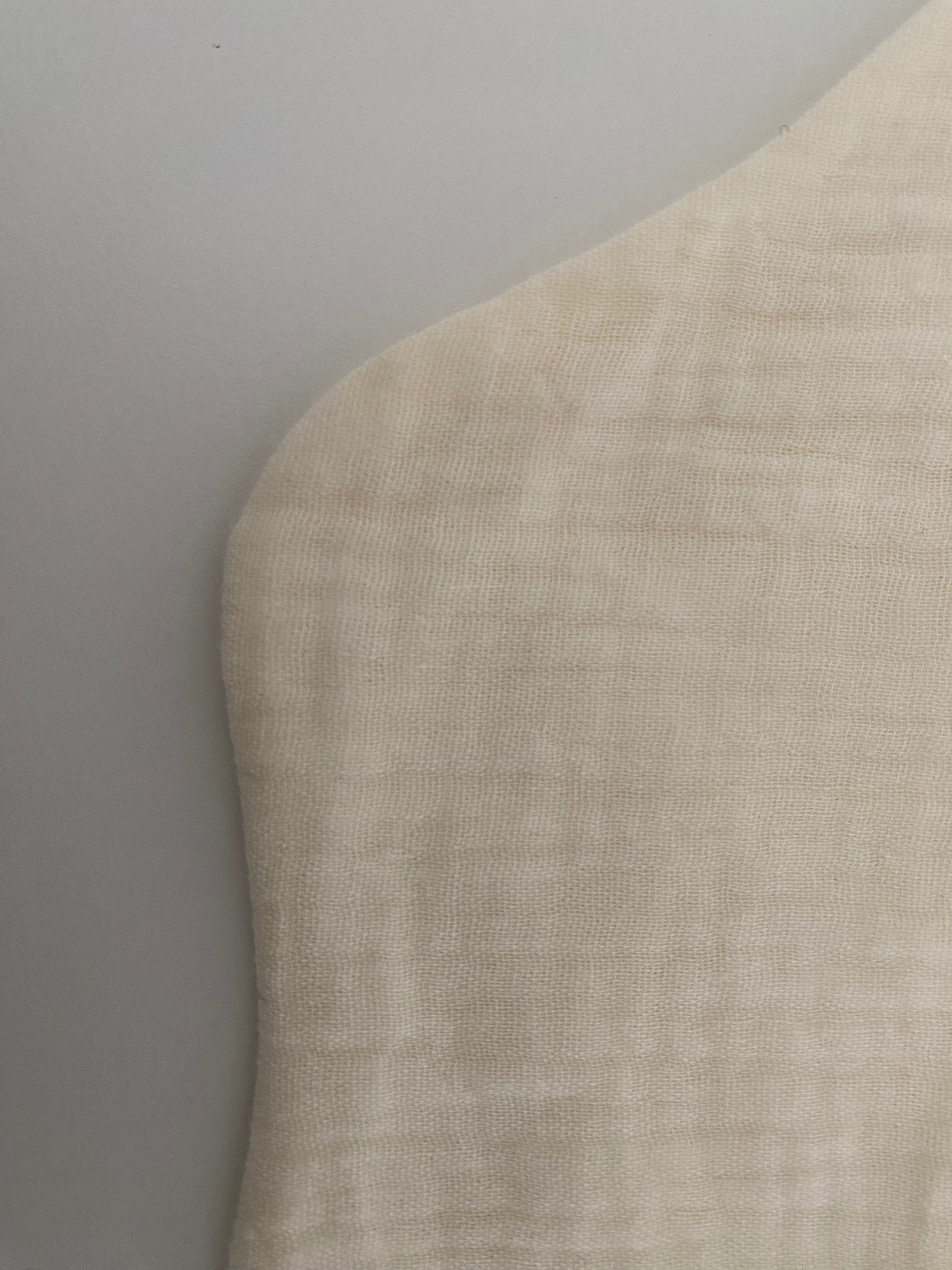 Råhvid hagesmæk i musselin, blød og behagelig.