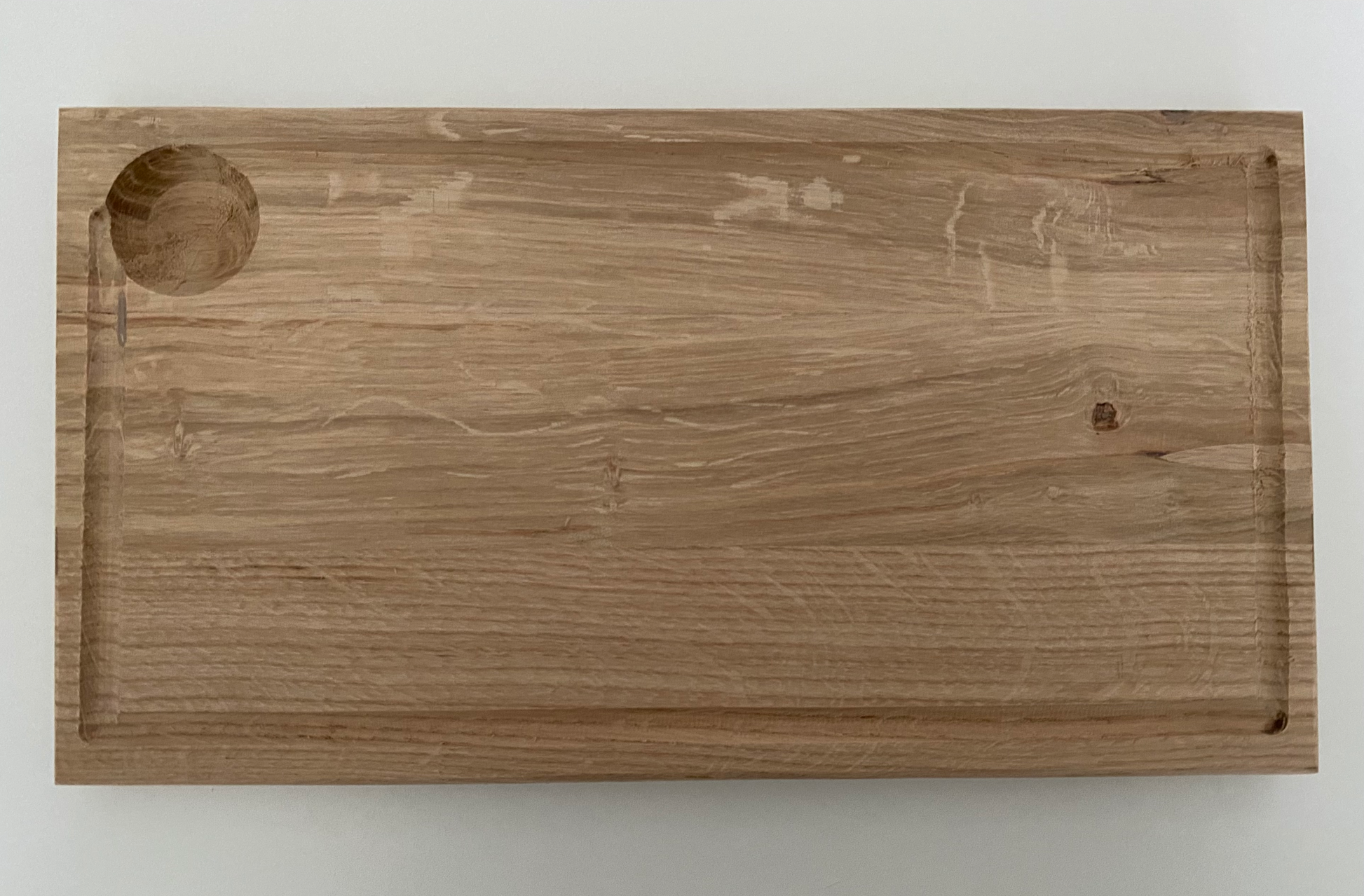 Lille skærebræt i træ med rille/hul hvor vandet kan løbe fra når man skærer grøntsager.