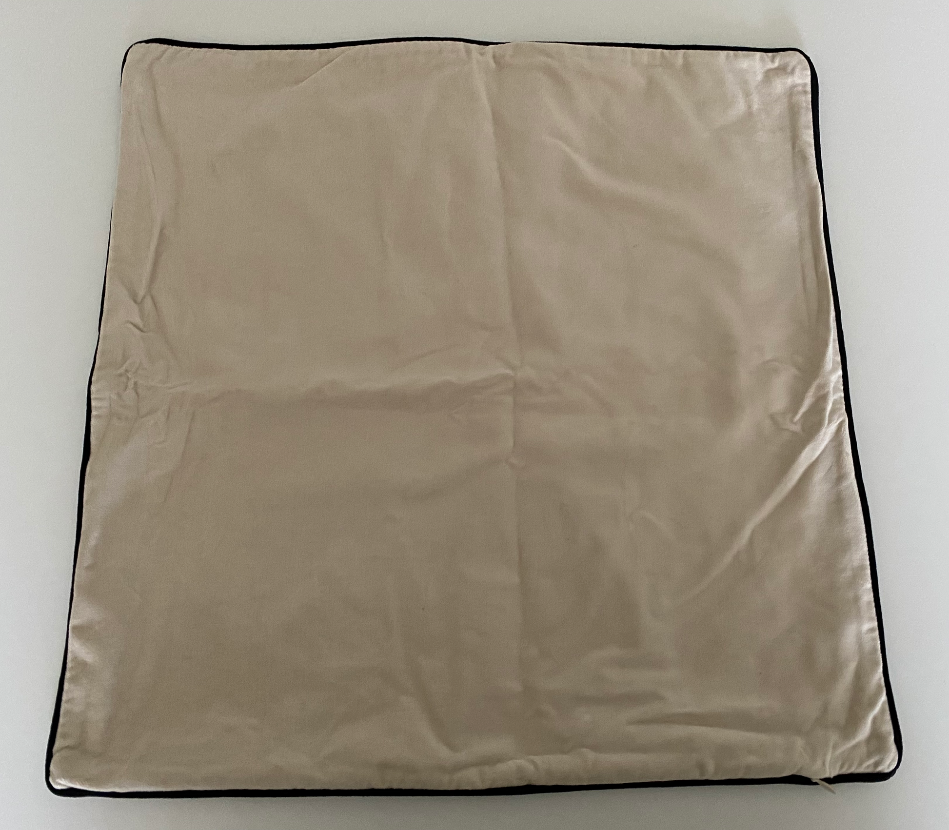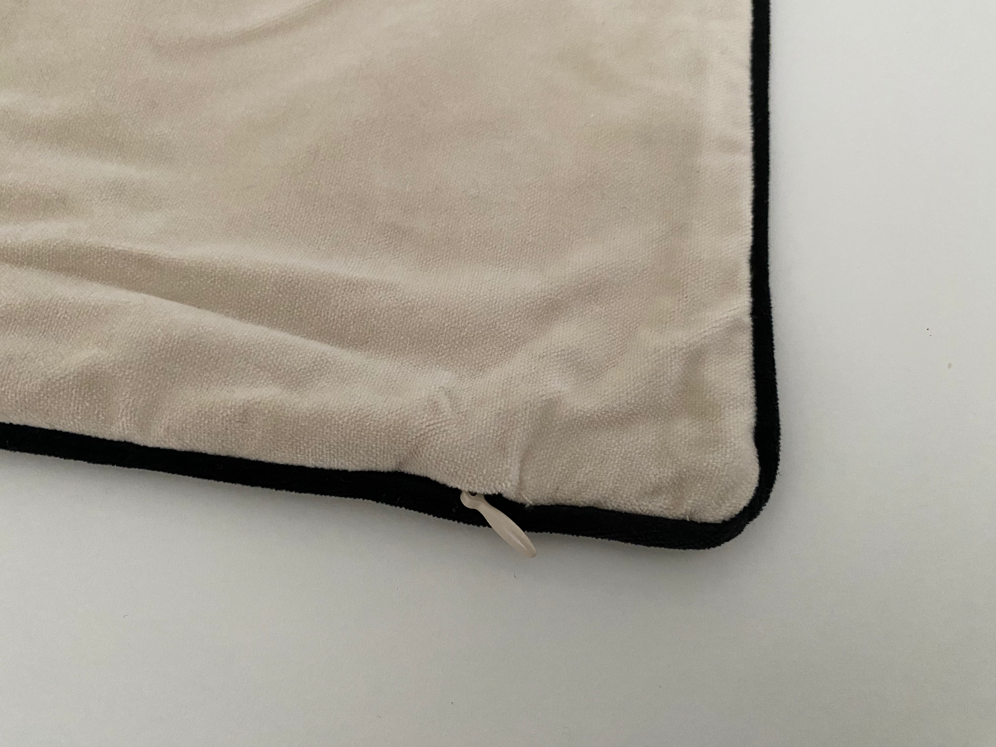 Råhvidt pudebetræk med sort kant. Med lynlås.