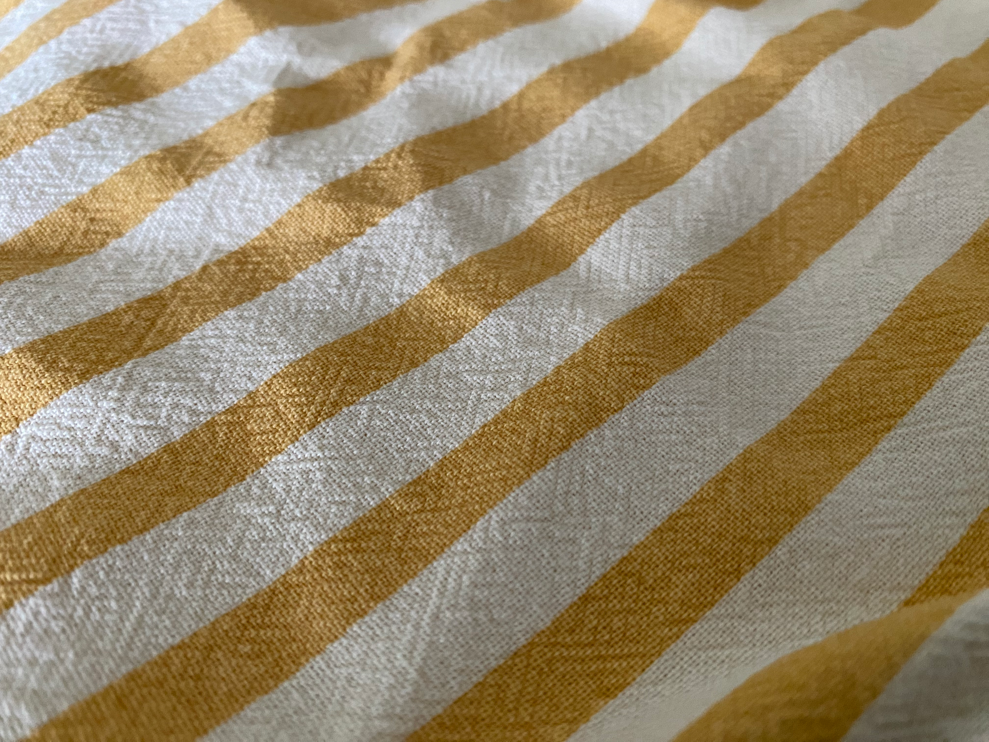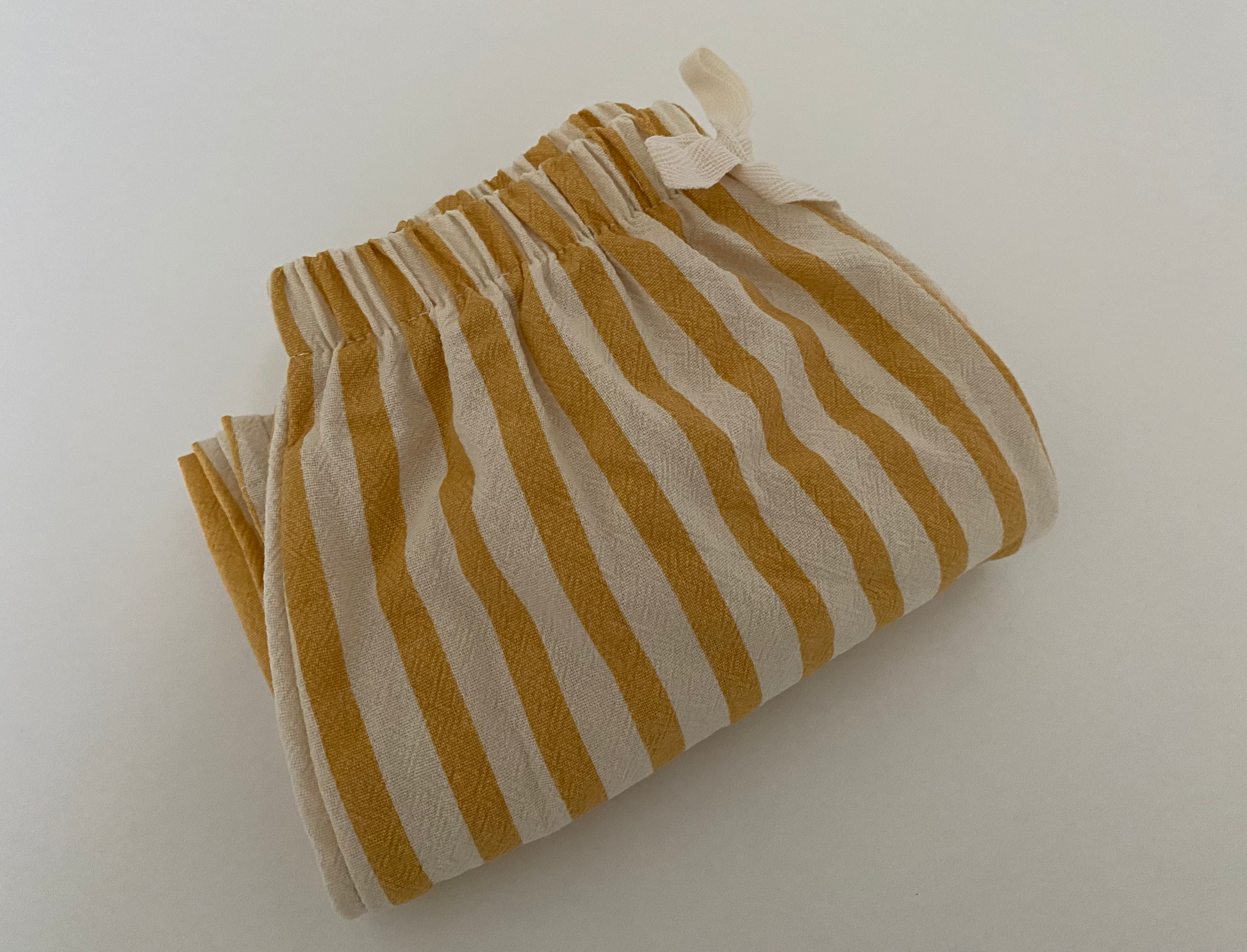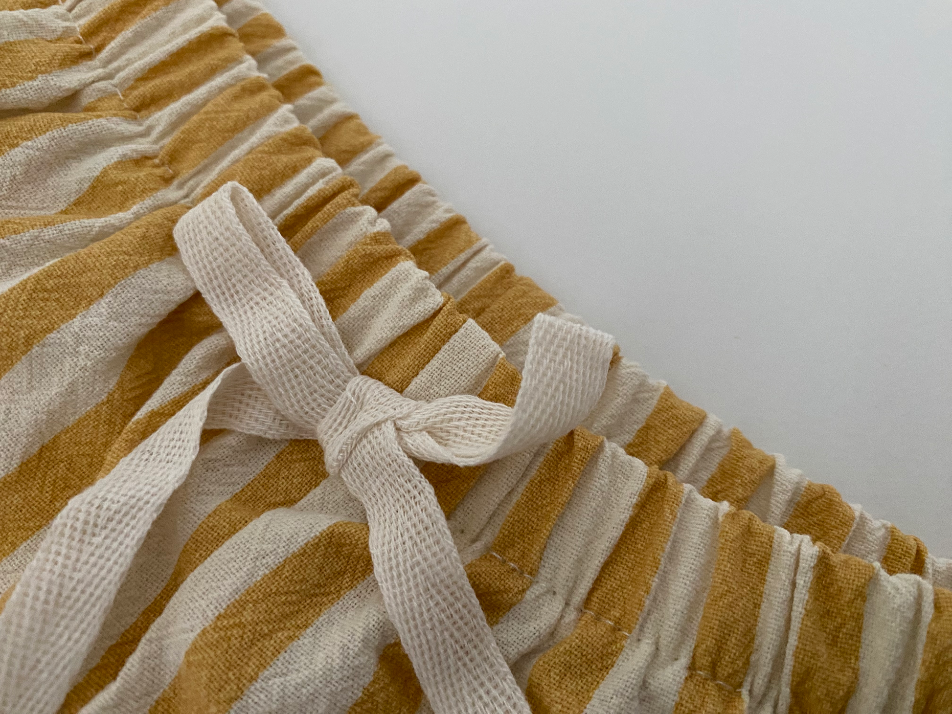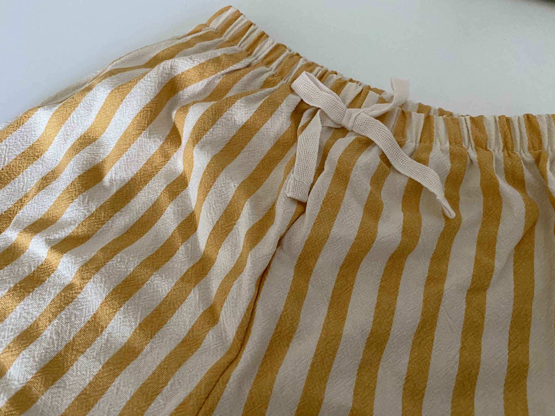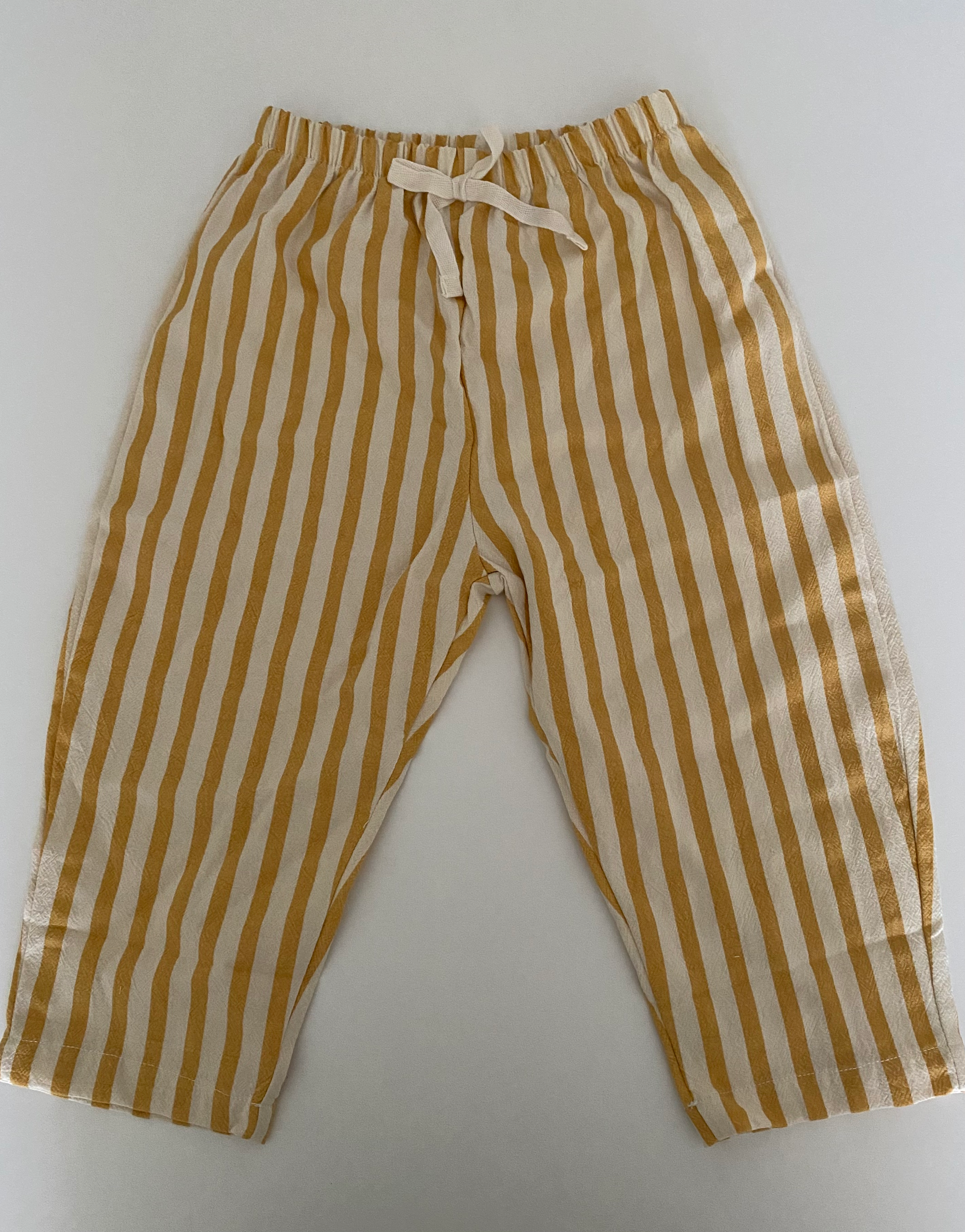 Stribede bukser i råhvid og mørkegul men råhvid stofsnor.